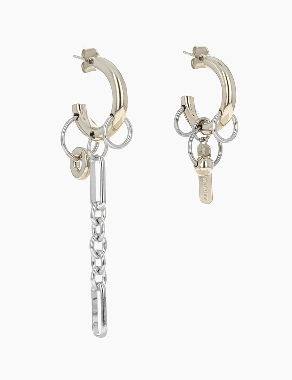 Pale gold mismatched medium open hoop earrings with pale gold + silver tone embellishments — beads, small rings + link chain — hanging from the hoops. Made in France