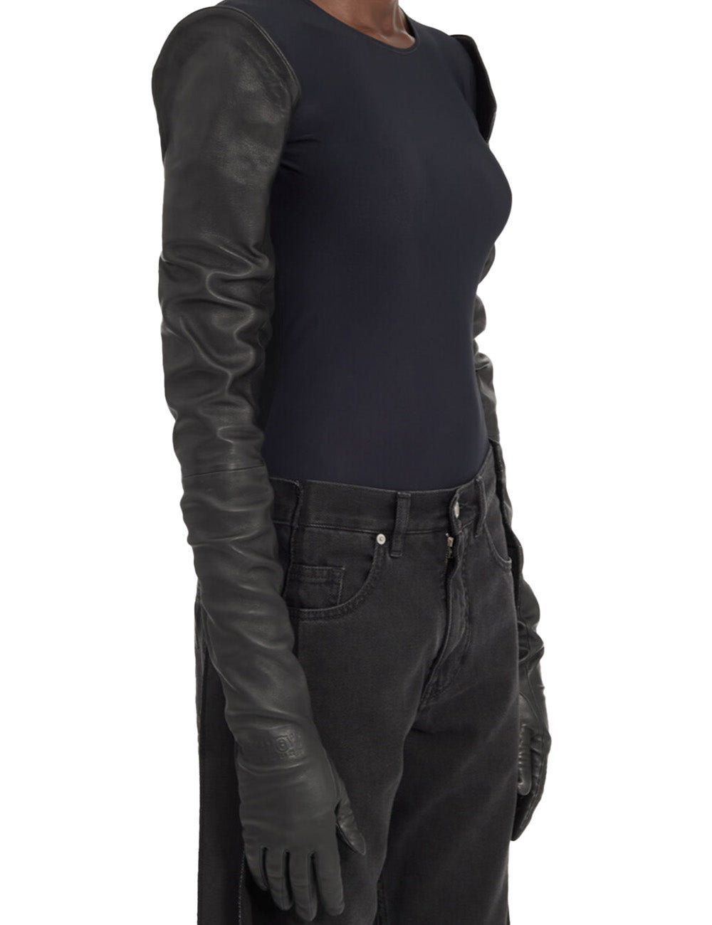 Extending beyond the elbow, these opera-length gloves blur the line between garment and accessory. Cut from supple glazed lambskin leather and lined in silk, they create a sculptural second skin that transforms styling into gesture. Part of the MM6 x Agnelle collaboration, they unite technical materials with contemporary styling.