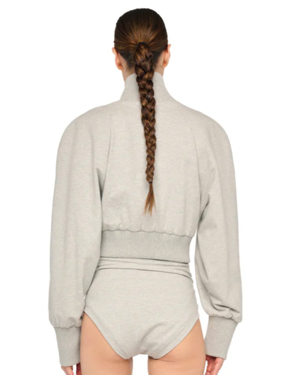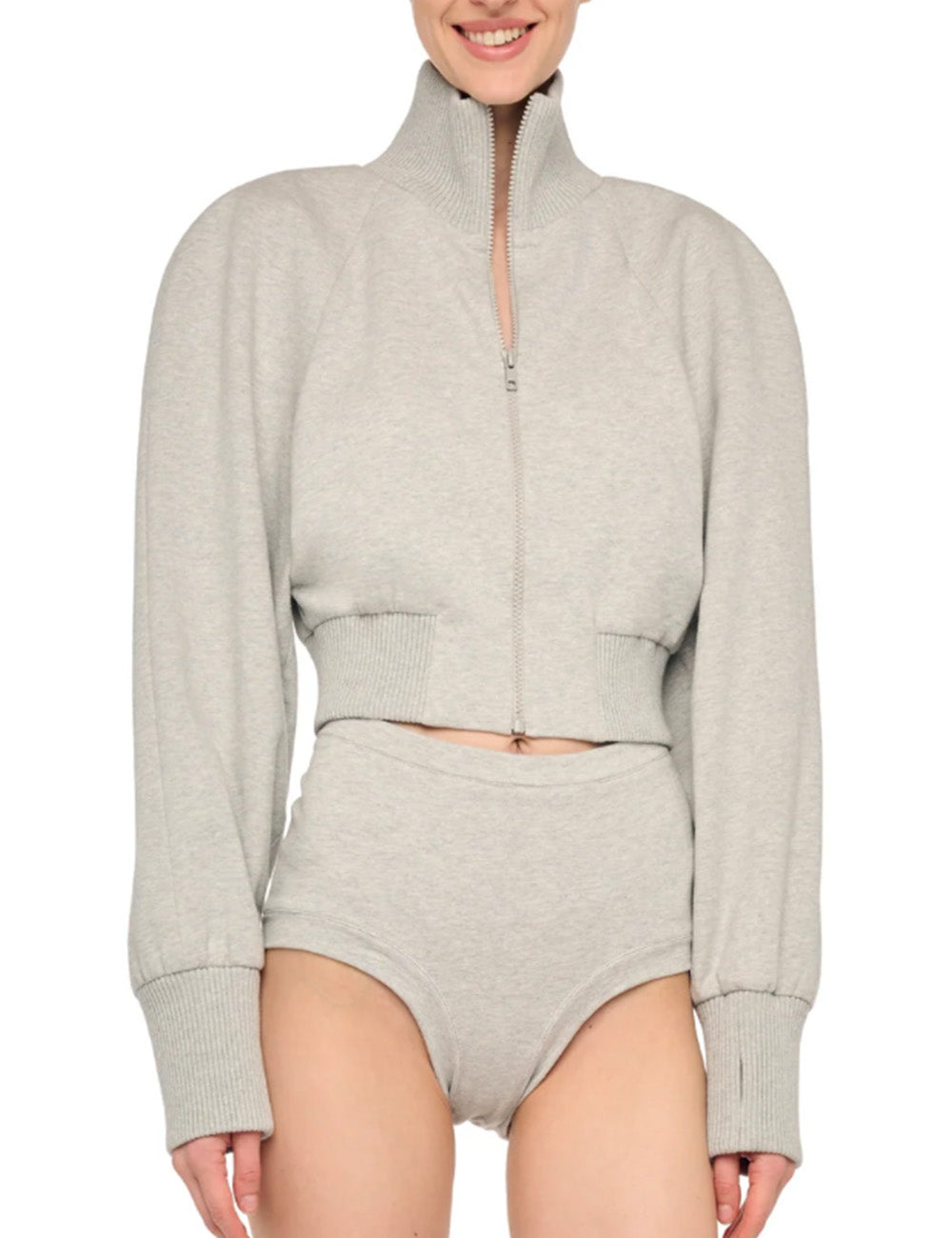 Relaxed fit versatile, oversized turtle heather gray bomber jacket inspired by Norma Kamali's vintage designs.