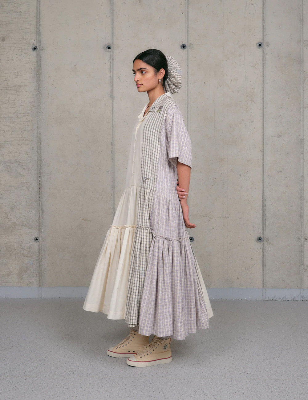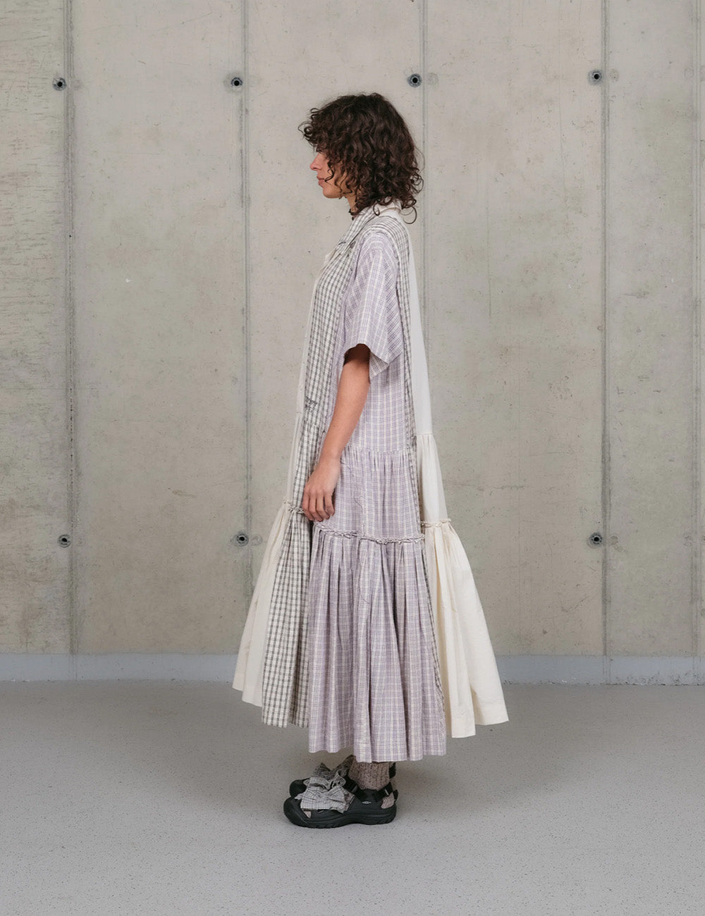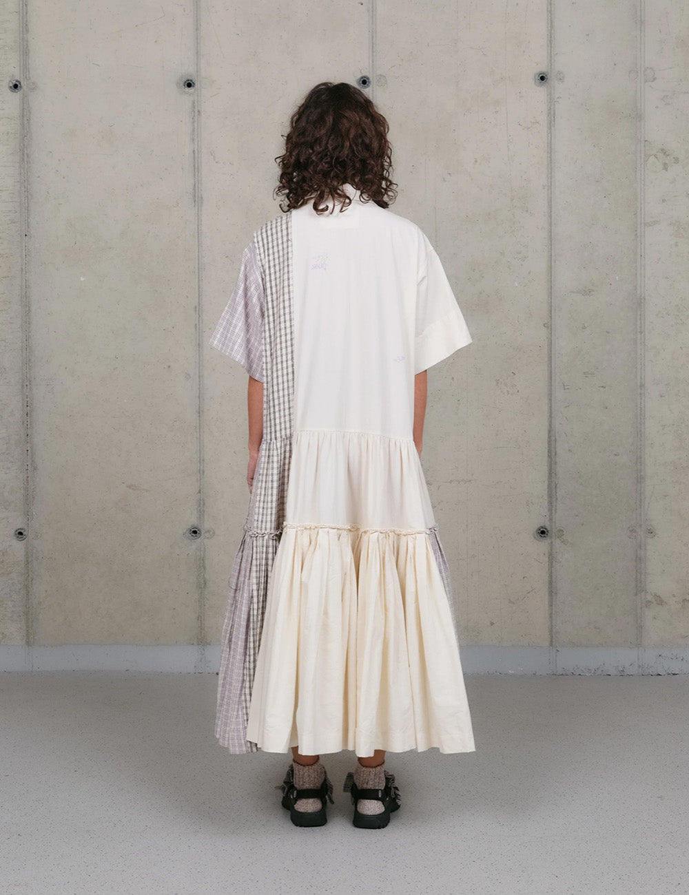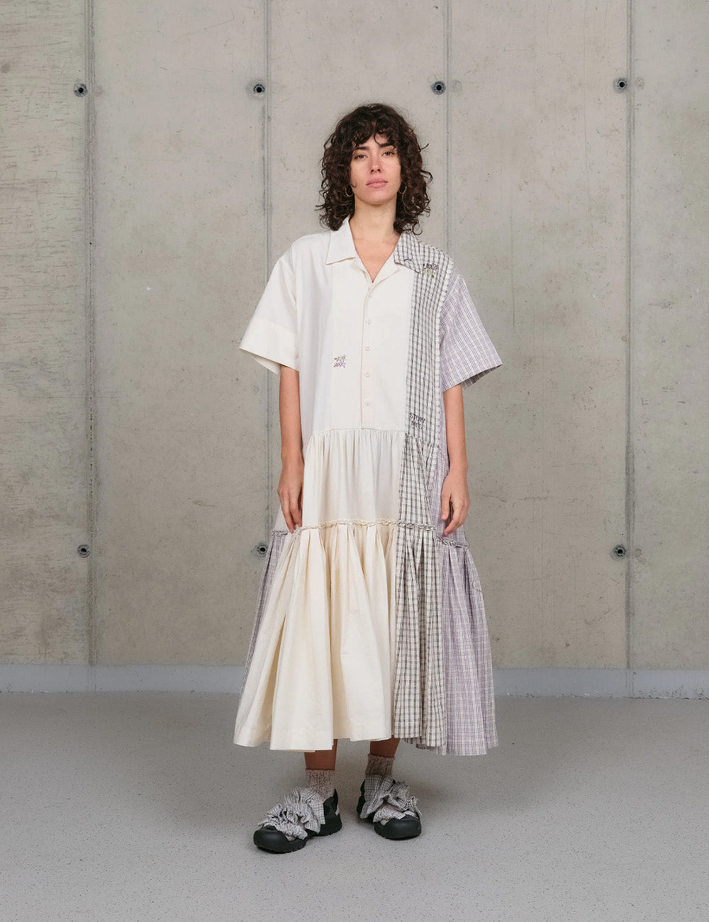 A full length, relaxed fitting short sleeve volume dress made from panelled patchwork handwoven fabrics with a raw edge detail. The Apple Dress is finished with a regular collar, stacked pleats, button placket and hand embroidered detailing.