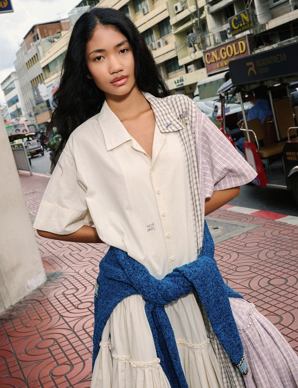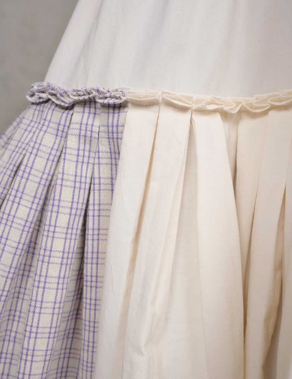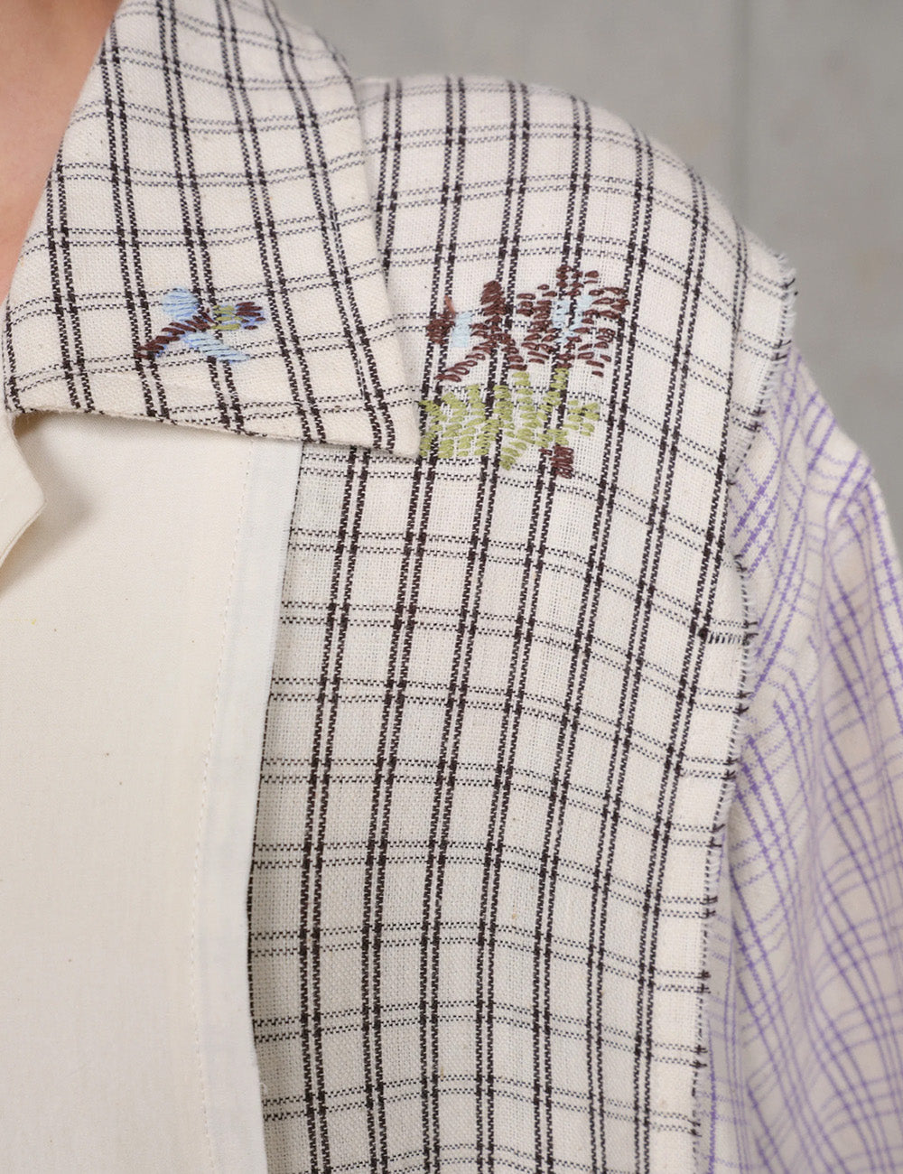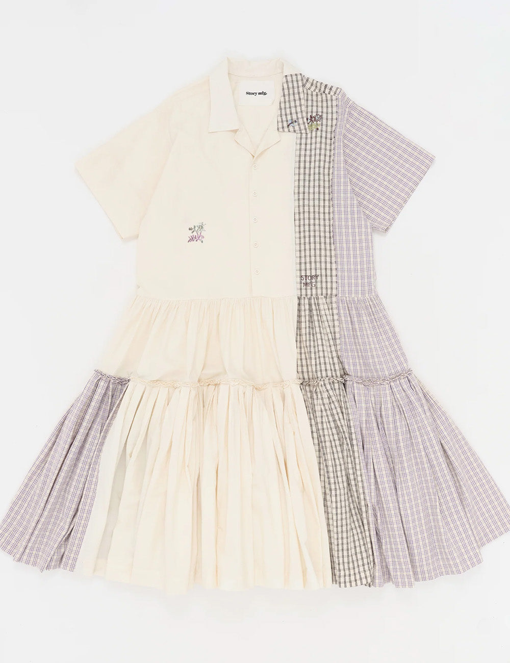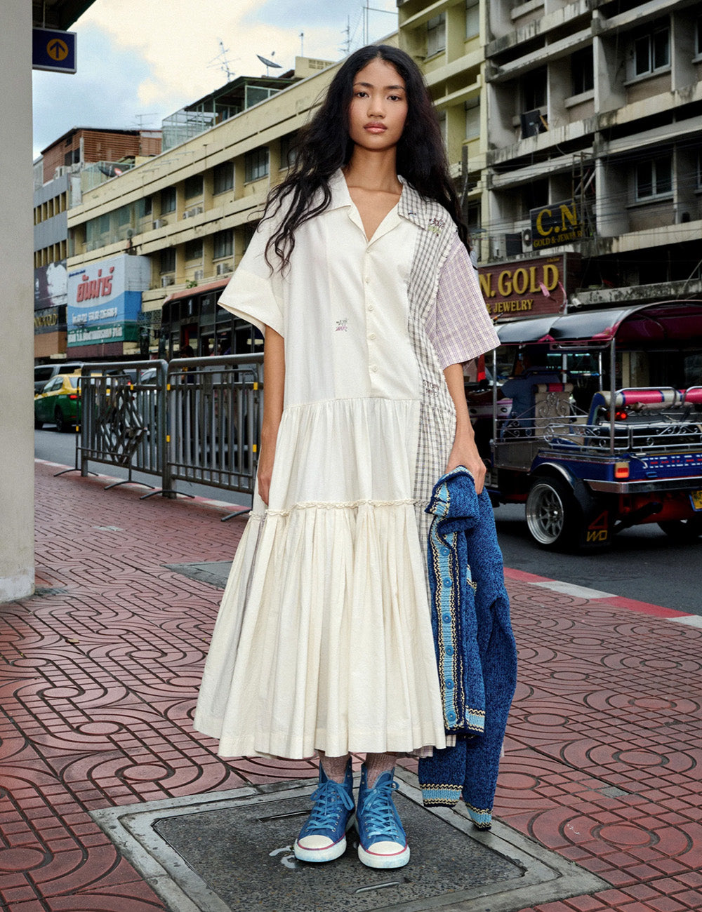 A full length, relaxed fitting short sleeve volume dress made from panelled patchwork handwoven fabrics with a raw edge detail. The Apple Dress is finished with a regular collar, stacked pleats, button placket and hand embroidered detailing.