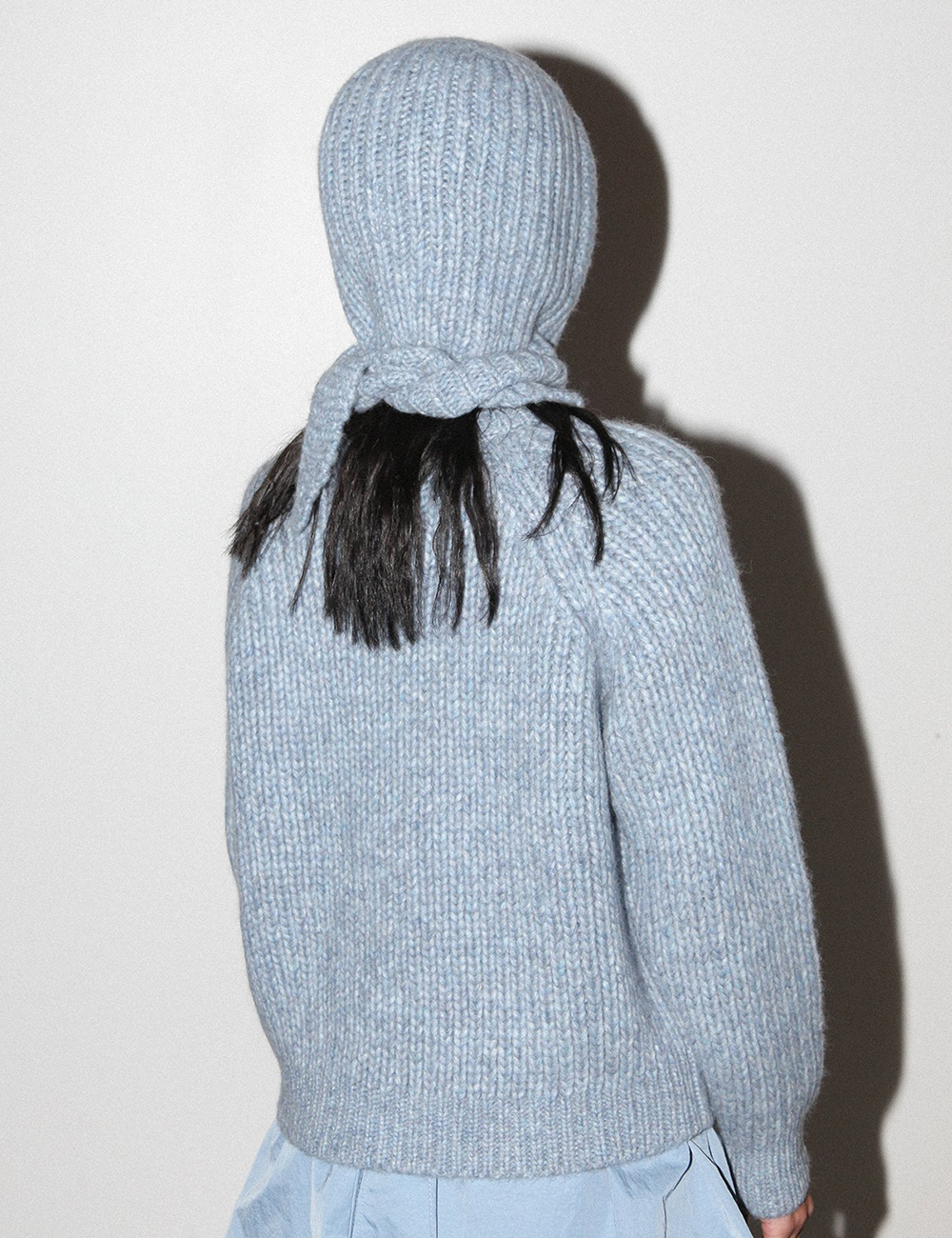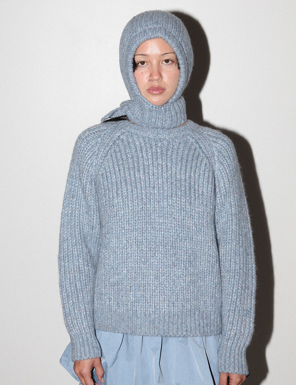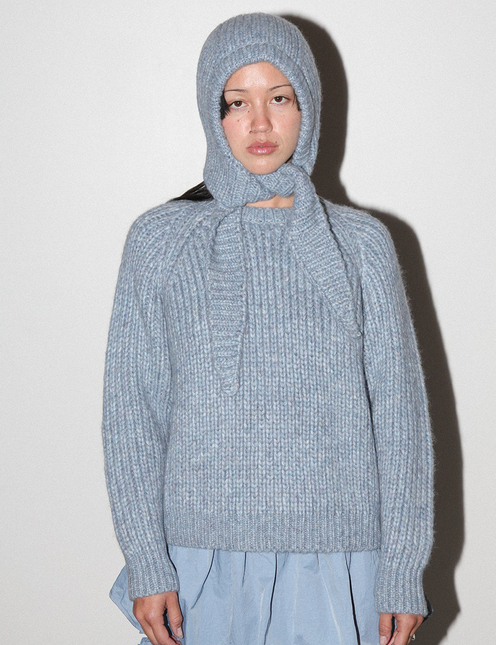 Fuzzy, soft, and very warm, this chunky headscarf is made of marled baby alpaca + merino wool blend yarns. Perfect for cold days when you still want to look chic. Pair with the Polar Sweater to achieve the full look!