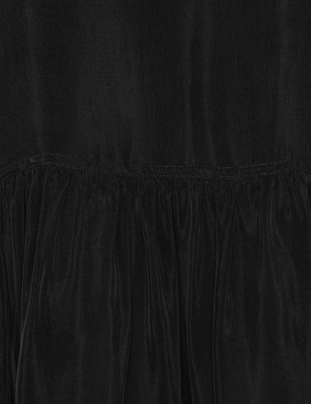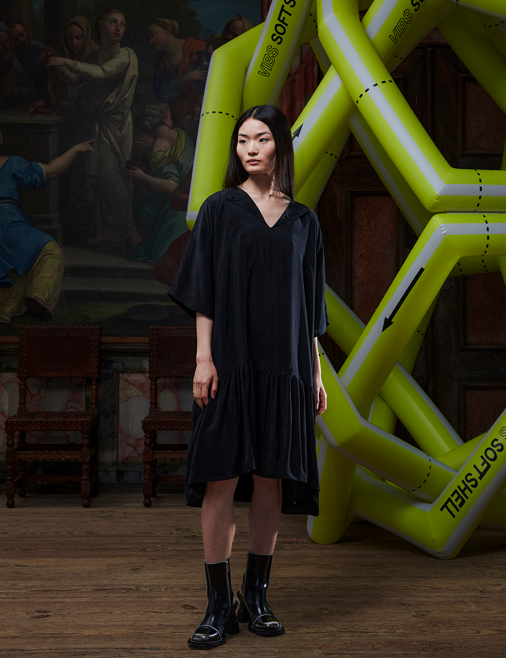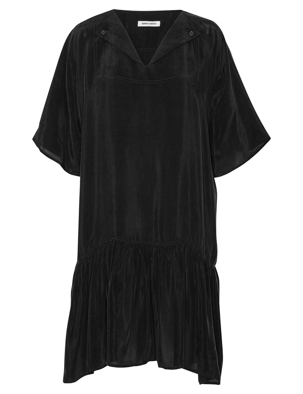 This midi black dress by Henrik Vibskov features half sleeves, a loose fit + gathered drop waist skirt. Chic, timeless, sensible.