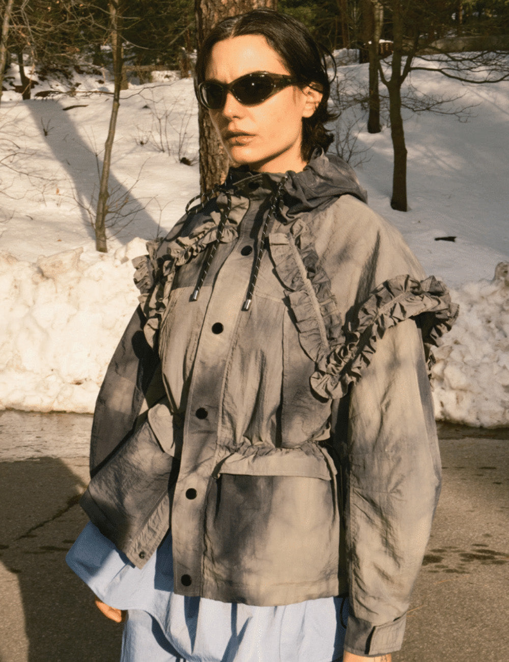 This recycled dyed nylon jacket is fully lined with nylon taslan and wind + water-repellent. Features an oversized self collar with ruffle detail + hood with built in self brim. Pair with the matching vest pack to complete the look!