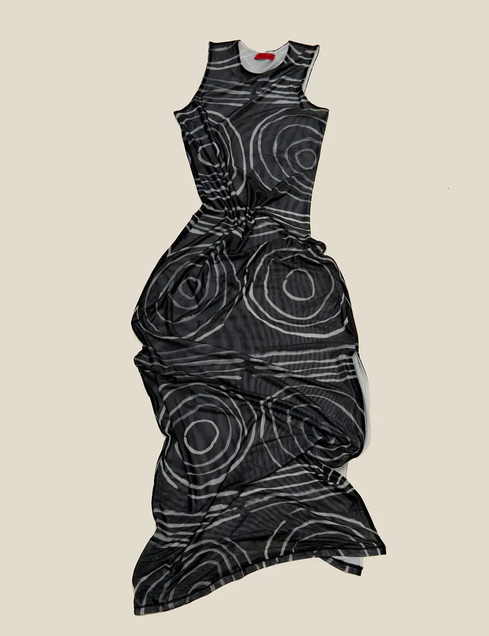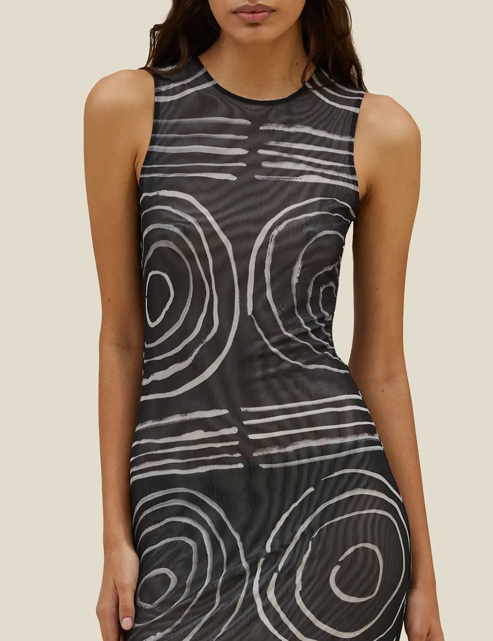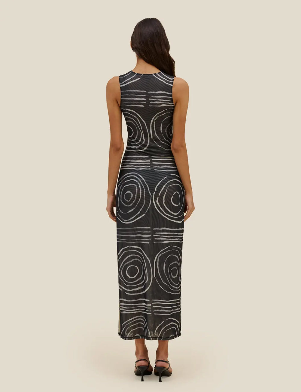 Slim-fit, full-length sleeveless dress in double-layer digitally printed micro mesh, featuring a distinct all-over print on the top layer and a slit at the left side seam.