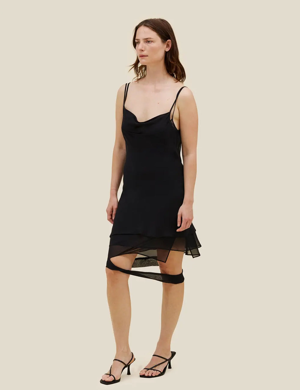 Double-layered dress in silk chiffon, featuring top-layer panels that kiss at the front and back, straight legs with a side-seam slit, an optional slip overlay.