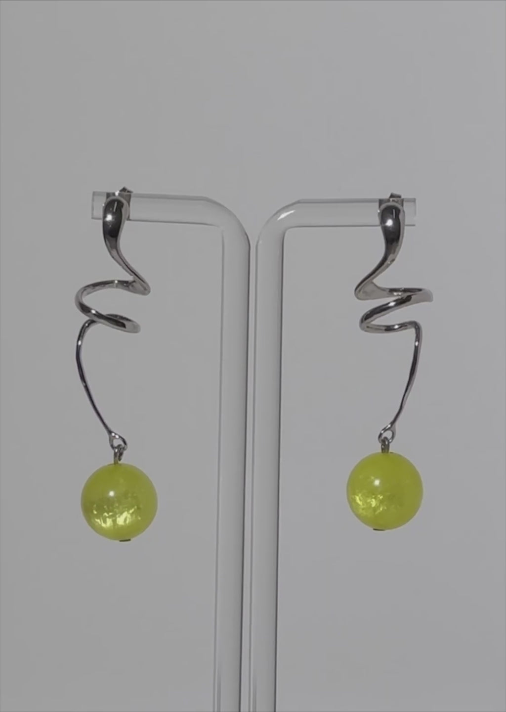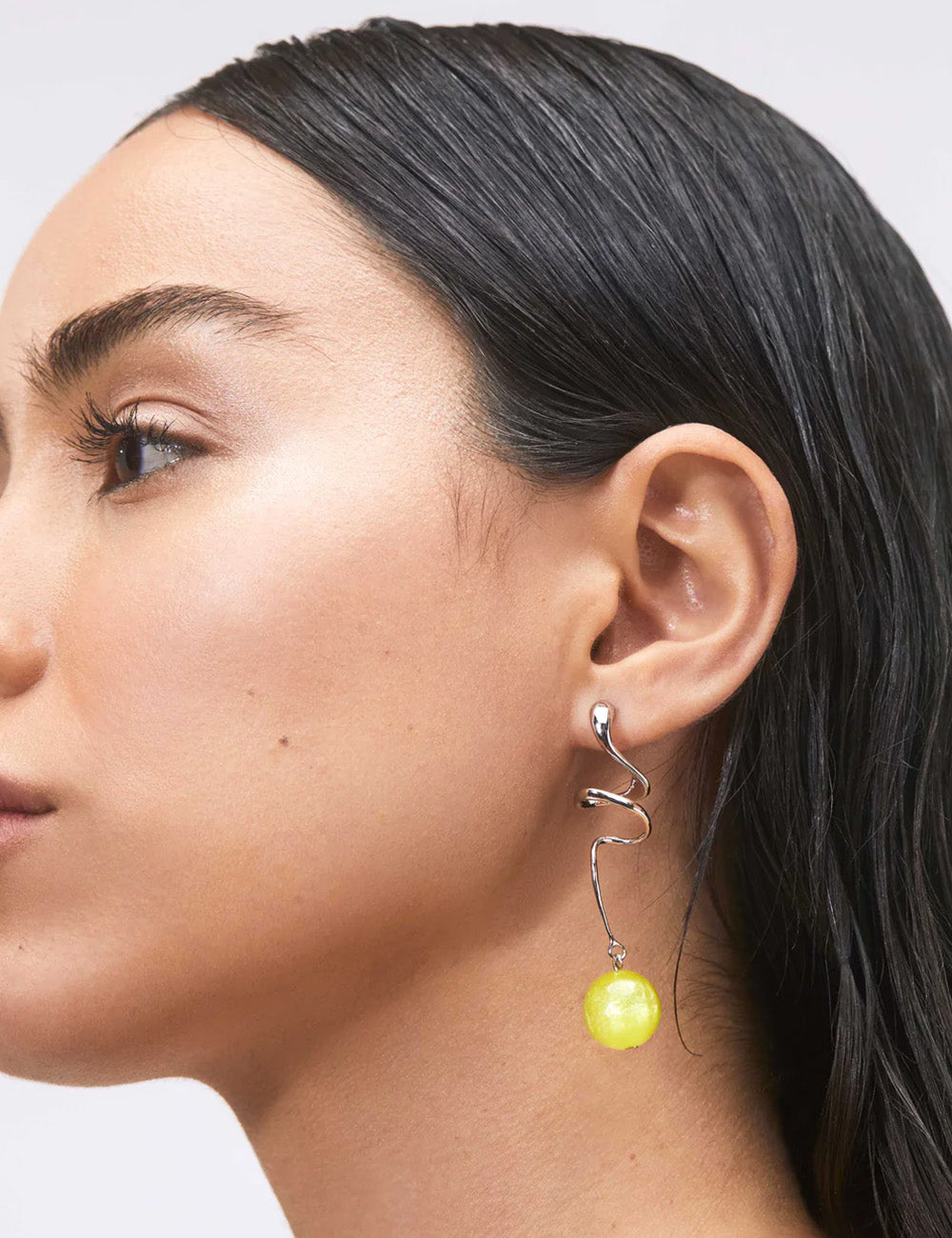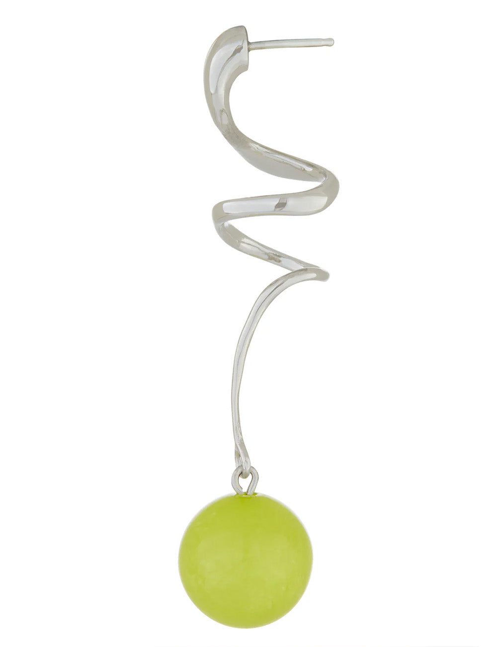 Chic swirl-drop earring adorned with a pearly bead in acid lime.