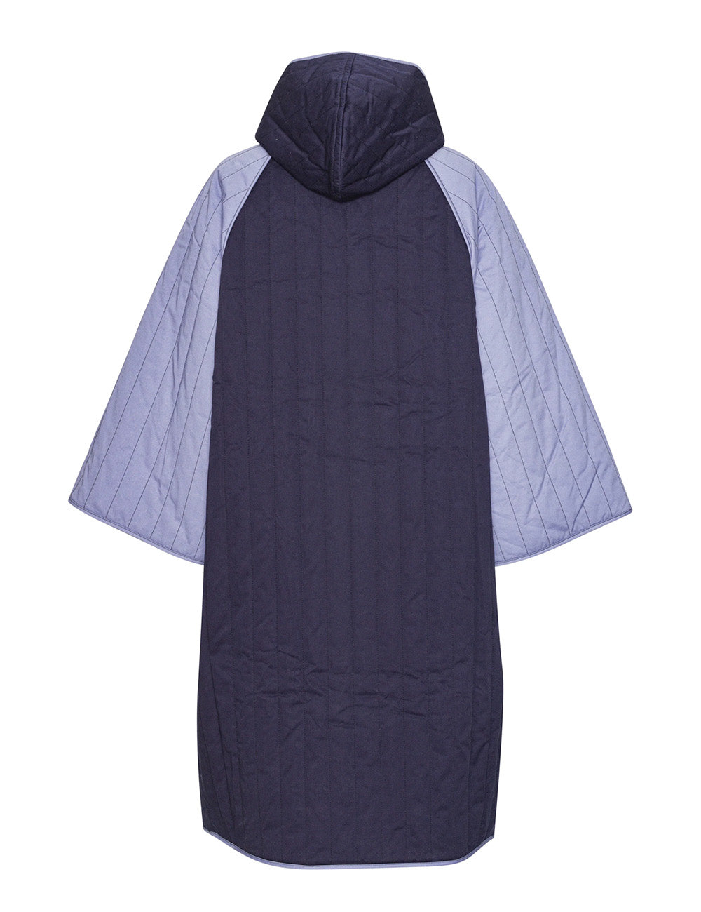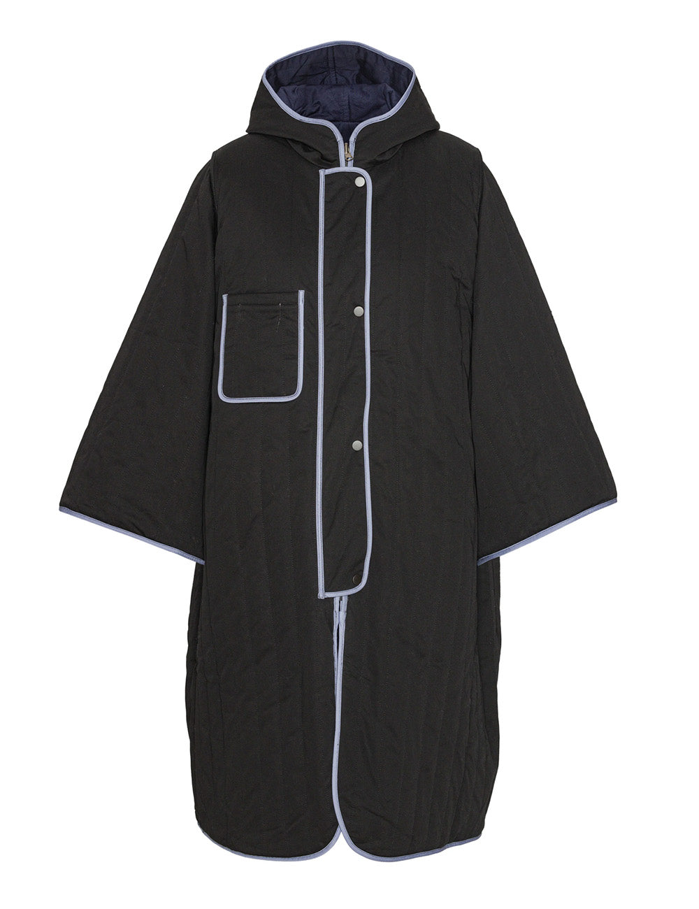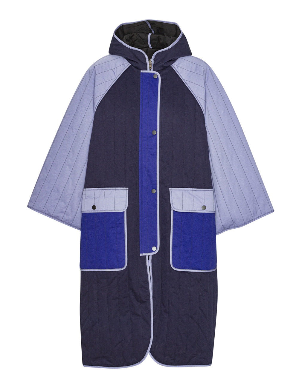 New Eco Reversible Coat by Henrik Vibskov in purple and black hues + hood.