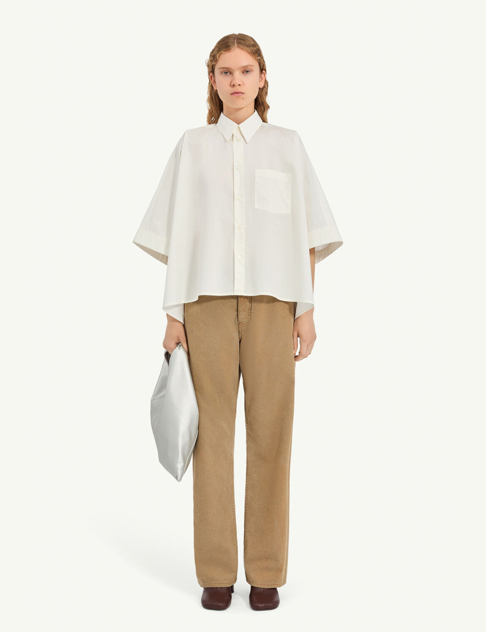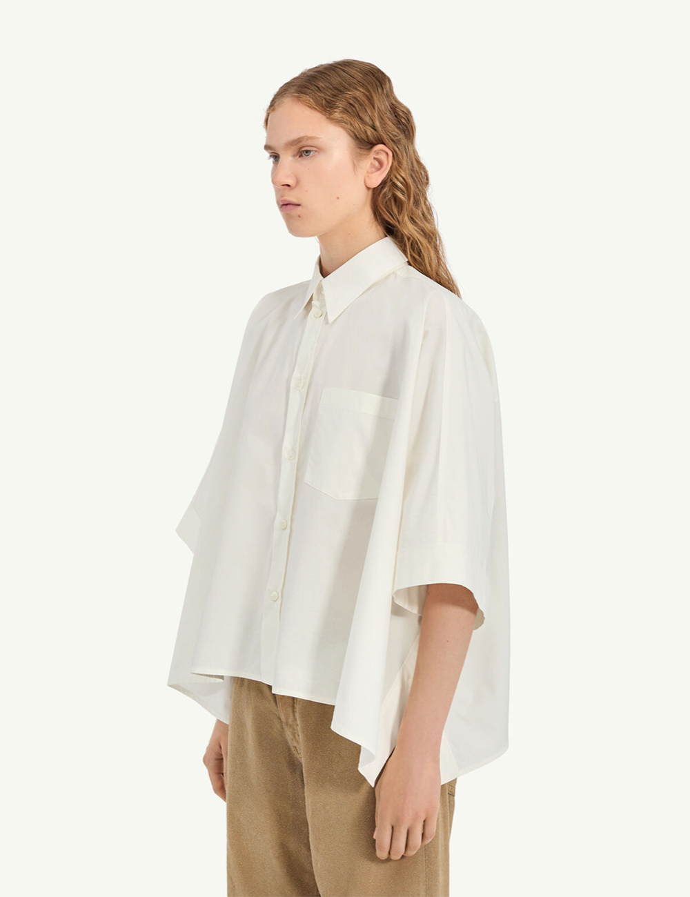 A white cotton shirt reworked with an oversized square panel construction. The wide sleeves and cropped hem exaggerate its proportions, while a sharp collar and buttoned front anchor the silhouette in classic tailoring. Finished with the MM6 white stitch line at the back. Sleeves feature button details and a cape-like fit.