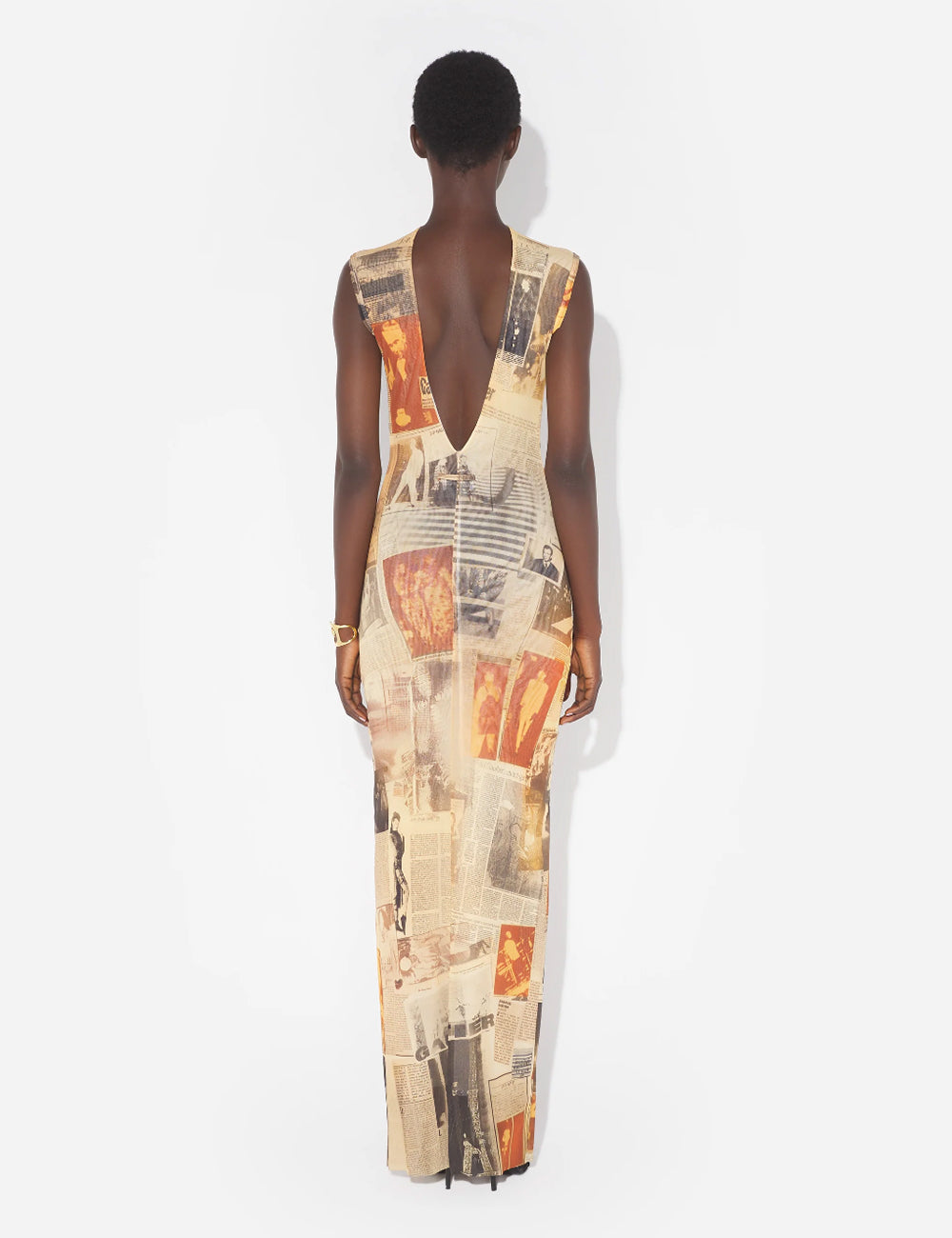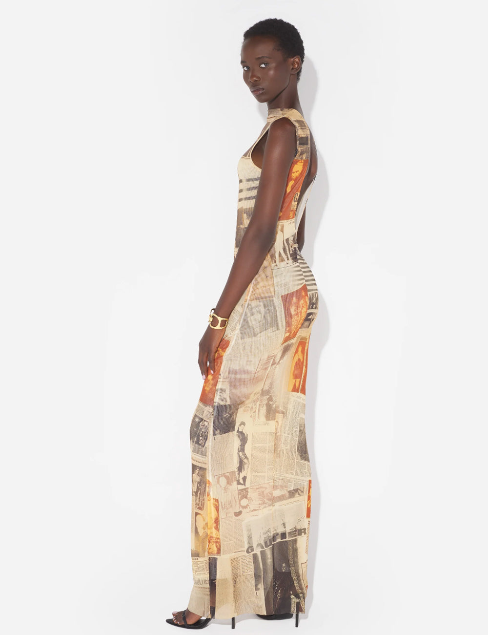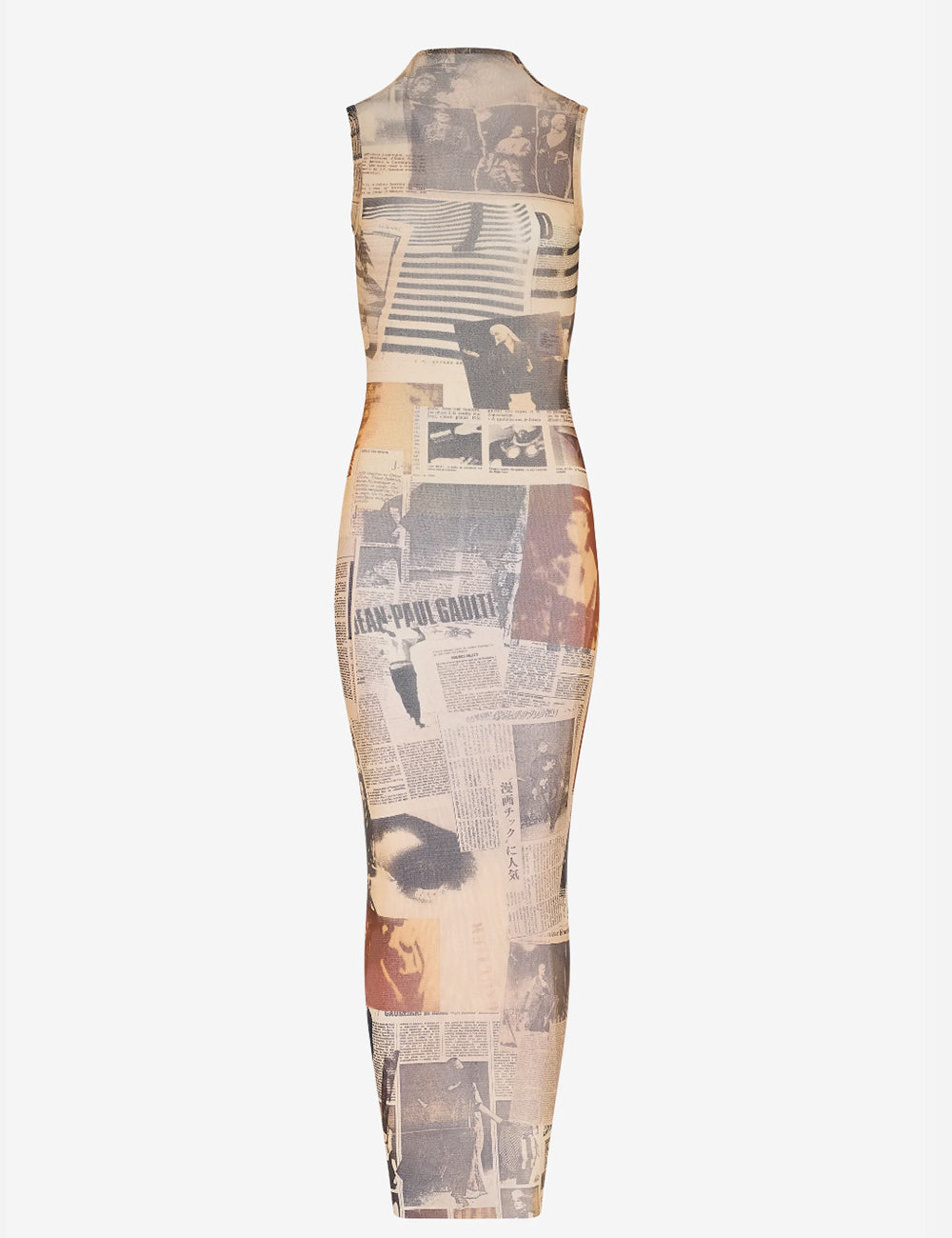 This long mesh maxi dress features iconic Jean Paul Gaultier journal print, with an open-backed and high neckline.