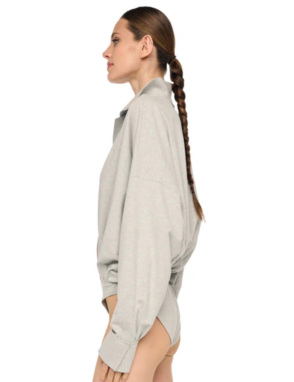 The perfect "shirt" in heather gray by iconic designer Norma Kamali. Timeless + cool with endless styling options!