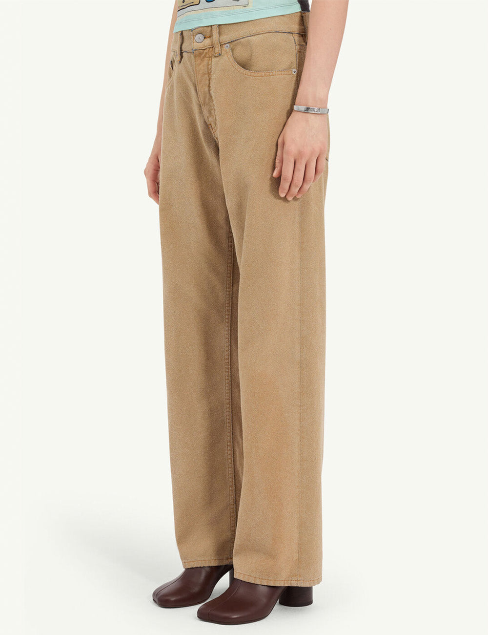 These unisex MM6 Maison Margiela jeans reinterpret a workwear staple with a sanded surface that gives a cool suede effect. The utilitarian design falls in a straight, elongated line with traditional five-pocket construction. At the back, the white stitch line and numeric patch signal MM6’s signature. Timeless + cool.