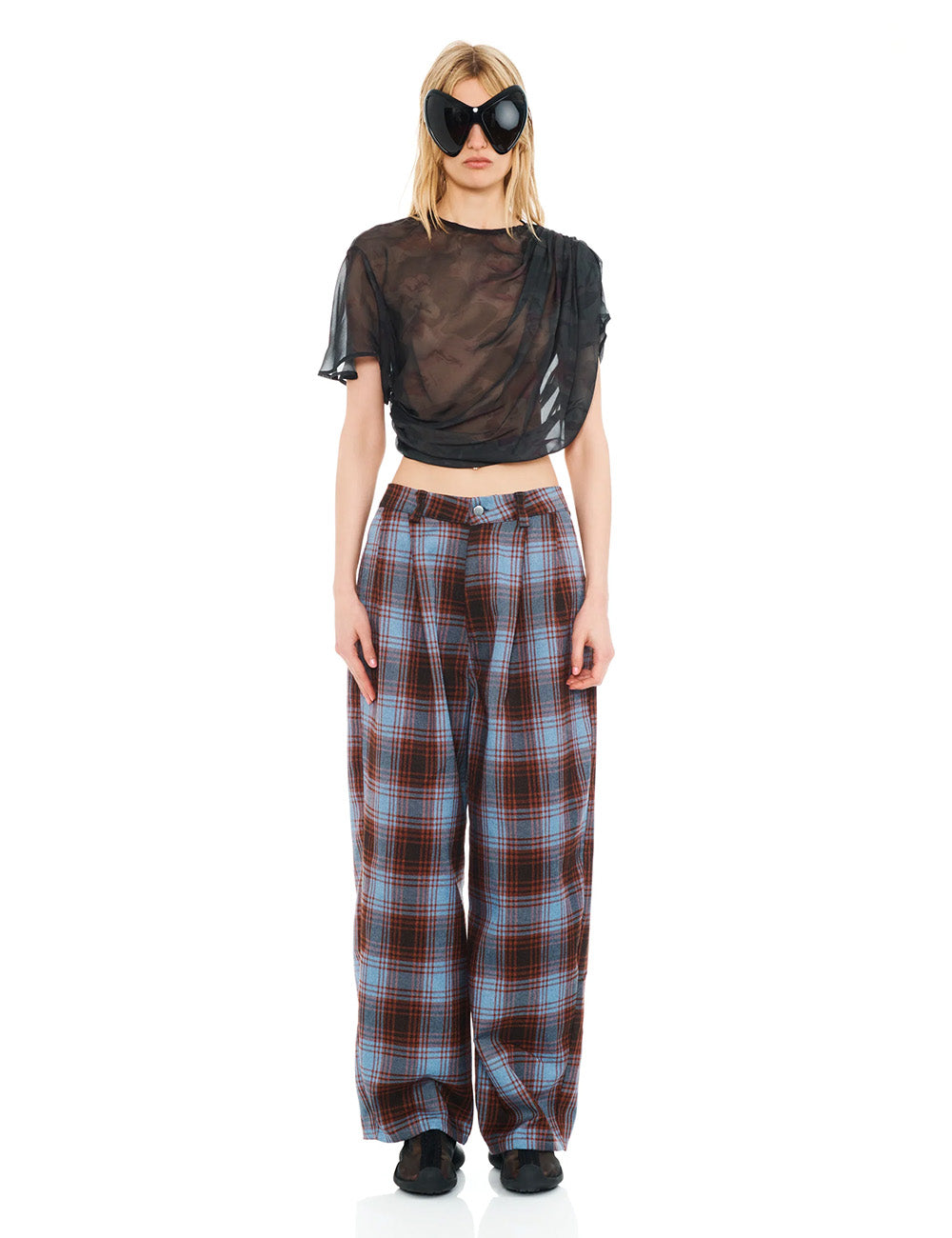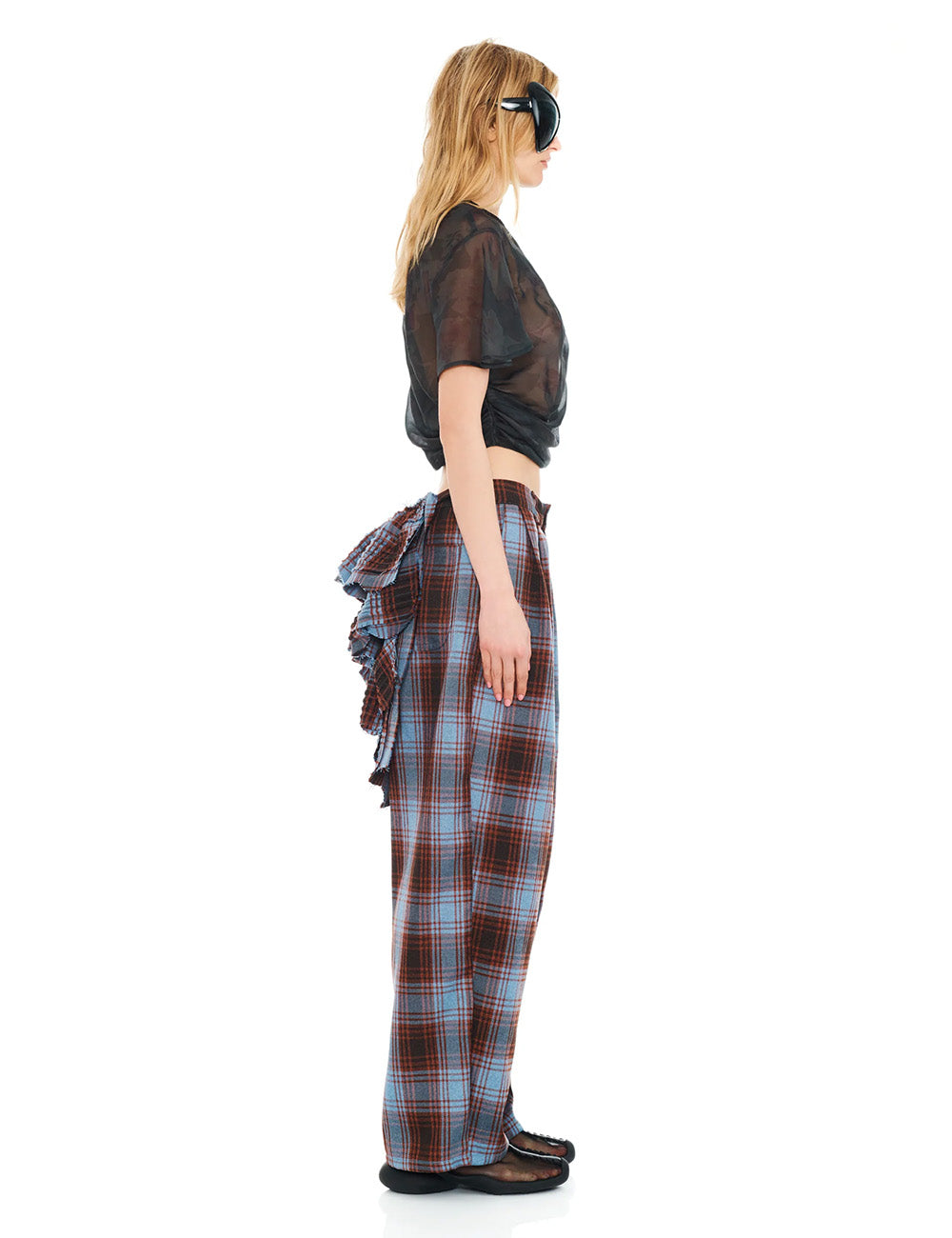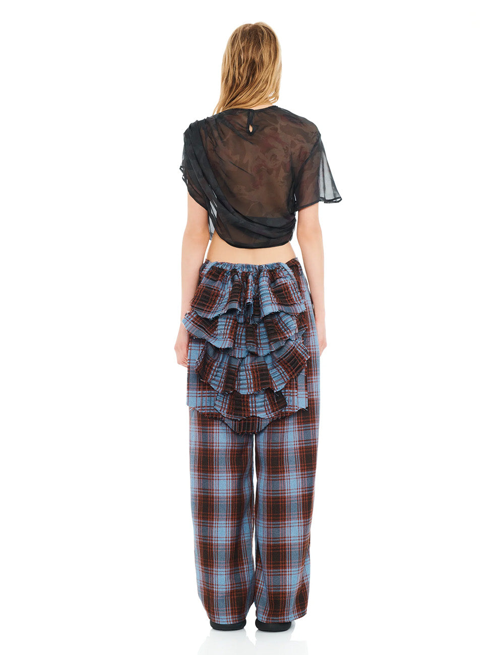 Mid rise pants, pleated in cranberry sky plaid with detachable ruffle bustle at back.