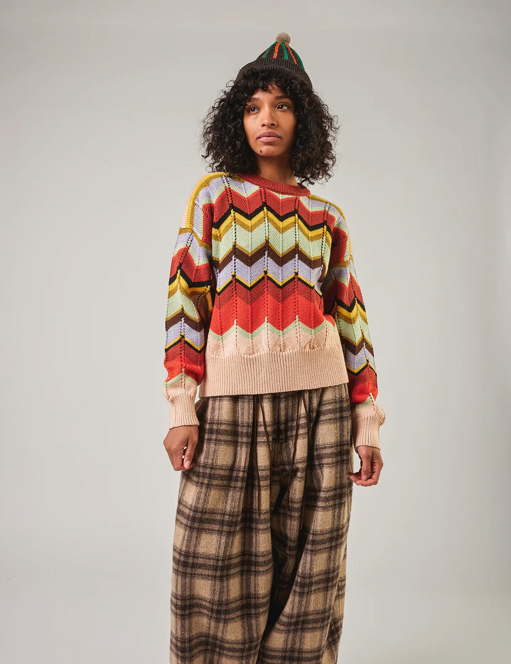 The iconic pattern of this cozy sweater pays homage to the great Missoni house. This colorway features a palette of shades evoking the changing colors of nature in fall.