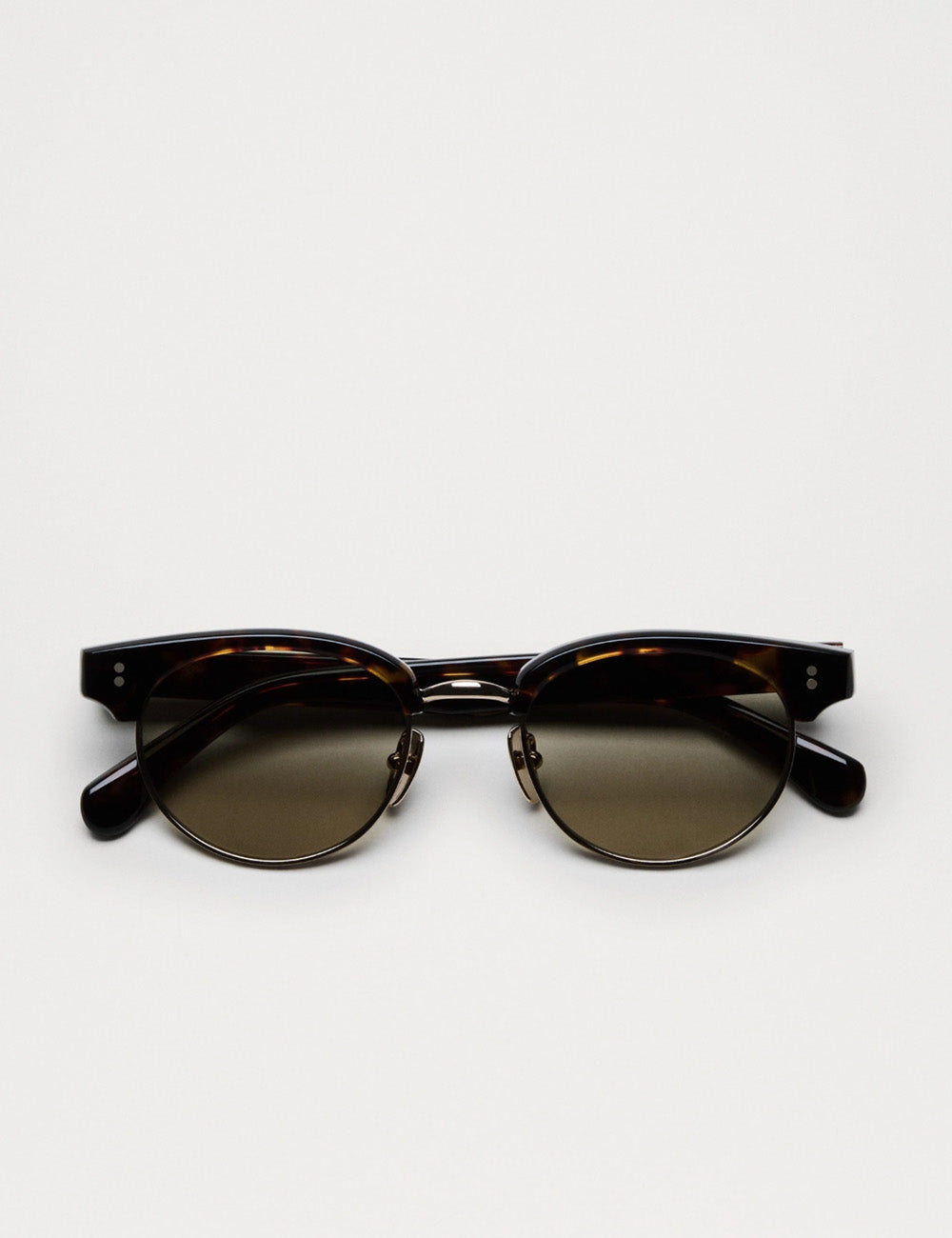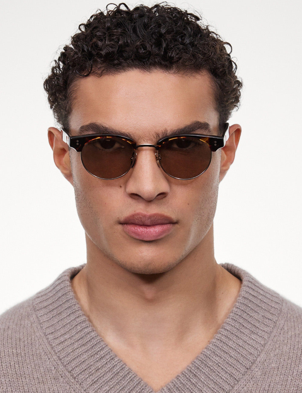 Mid-century silhouette, modern sunwear. Page balances bold browline structure with slim metal rims for a vintage-inspired look that reads smart, sharp, and a little cinematic. Handcrafted in Acetate Renew™ with CR39 lenses that offer 100% UVA and UVB protection. Page is a round frame with a structured browline and a balanced fit. It favors small to medium heads.